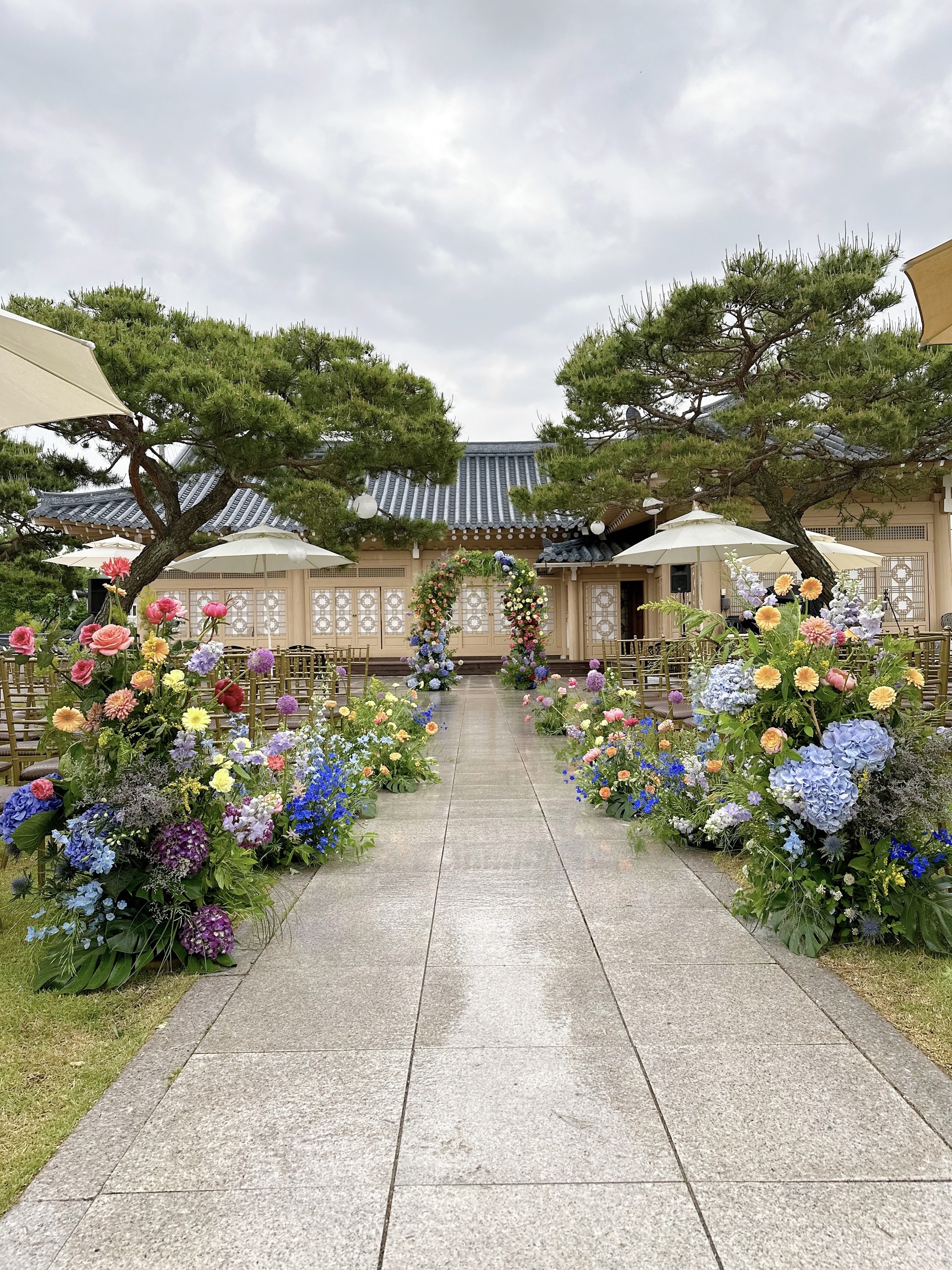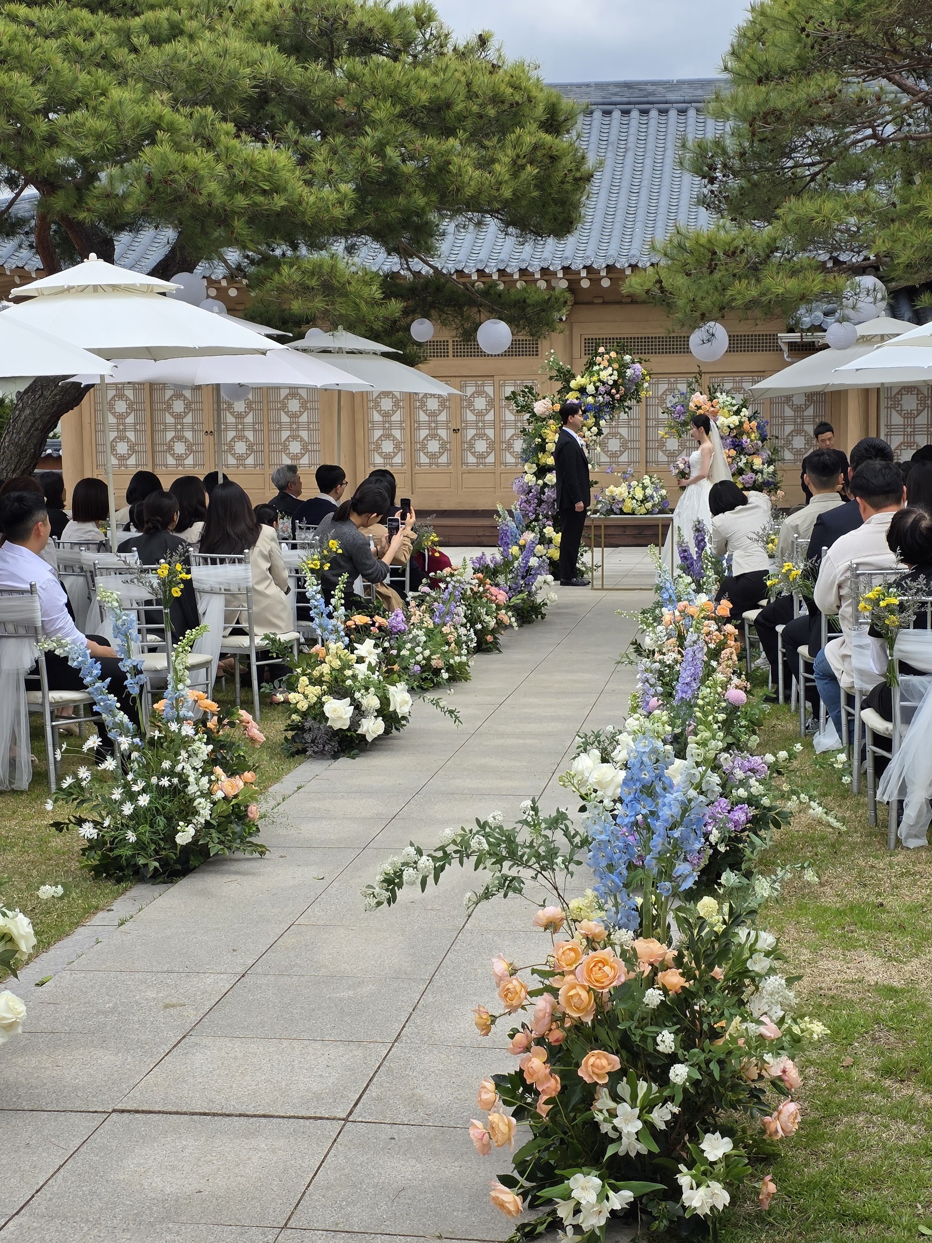 밝은 톤의 한옥 컬러로 캐주얼한 웨딩 연출 가능